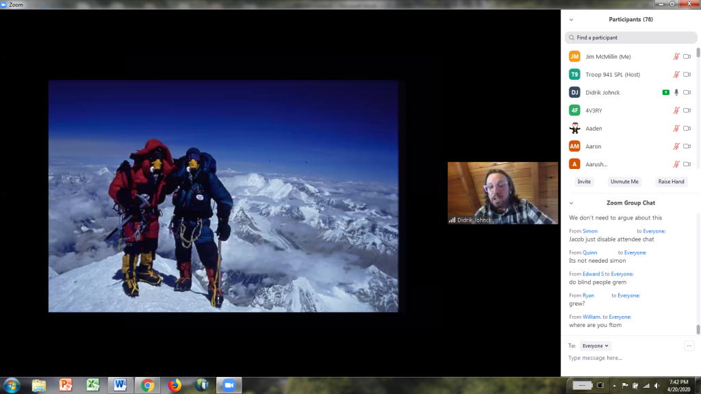 Scouting has been harder to do during the pandemic, but Troop 941 shows it’s still possible. For an April meeting the troop held an on-line meeting featuring guest speaker Didrik Johnck. He narrated a slide slow entitled “Eagle to Everest”. His presentation was originally scheduled to be delivered at a troop meeting, but events changed and a switch was made to on-line. A good example of being flexible and prepared for “any old thing”.